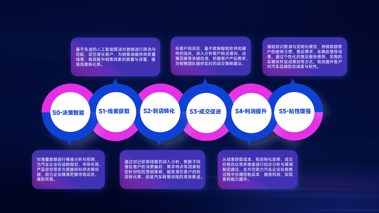 基于销售转化漏斗的薄弱环节,,为客户提供数据+模型+运营的智能应用,,,,实现销售业绩的提升;推动线索管理全链路的精细化管理和运营。。
